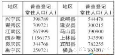 数据一:全市常住人口中,6城区常住人口总数为343.72万人,占全市常住人口的51.6%,男性人口占51.85%;女性人口占48.15%,其中,6县常住人口总数为322.44万人,占全市常住人口的48.4%。分县区看,西乡塘、宾阳县、横县分列全市12县区常住人口前3位(如下表)。