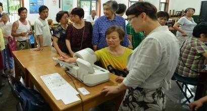 上海天佑医院给莲花公寓居民送来的第二个健康大红包是,新型电子血压计,社区居民 在居委会义诊中,见过的都是普通血压计,这次,上海天佑医院将最新的电子血压计带到社区去,给很多老年人开了眼界。你看,长长的队伍一直排到门外。